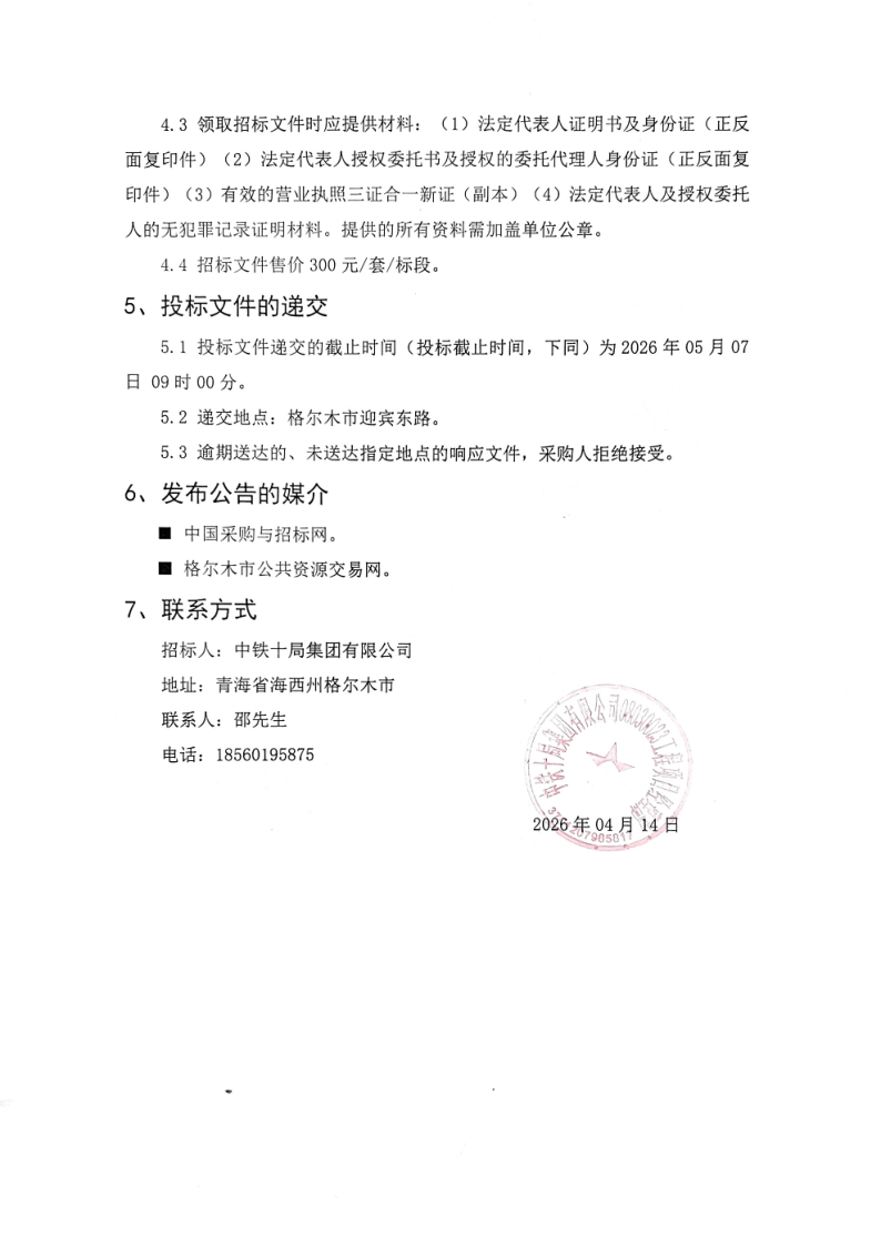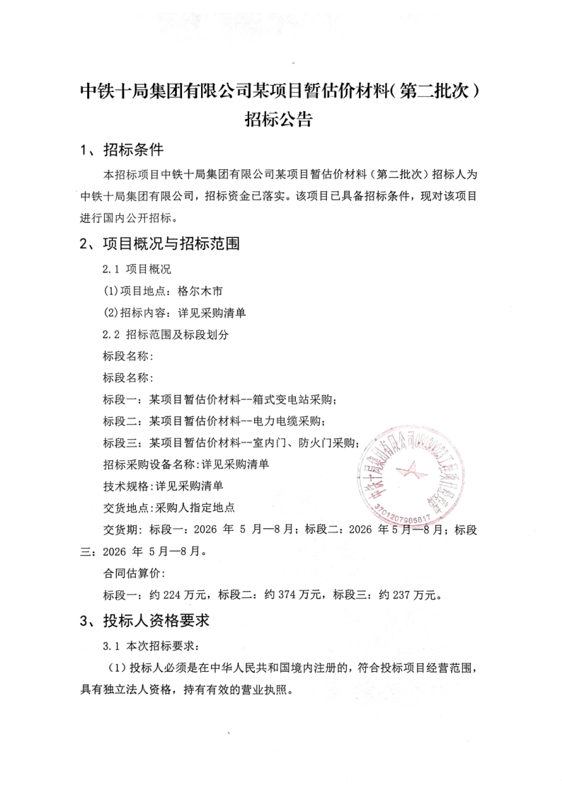 中铁十局集团有限公司某项目暂估价材料(第二批次)招标公告