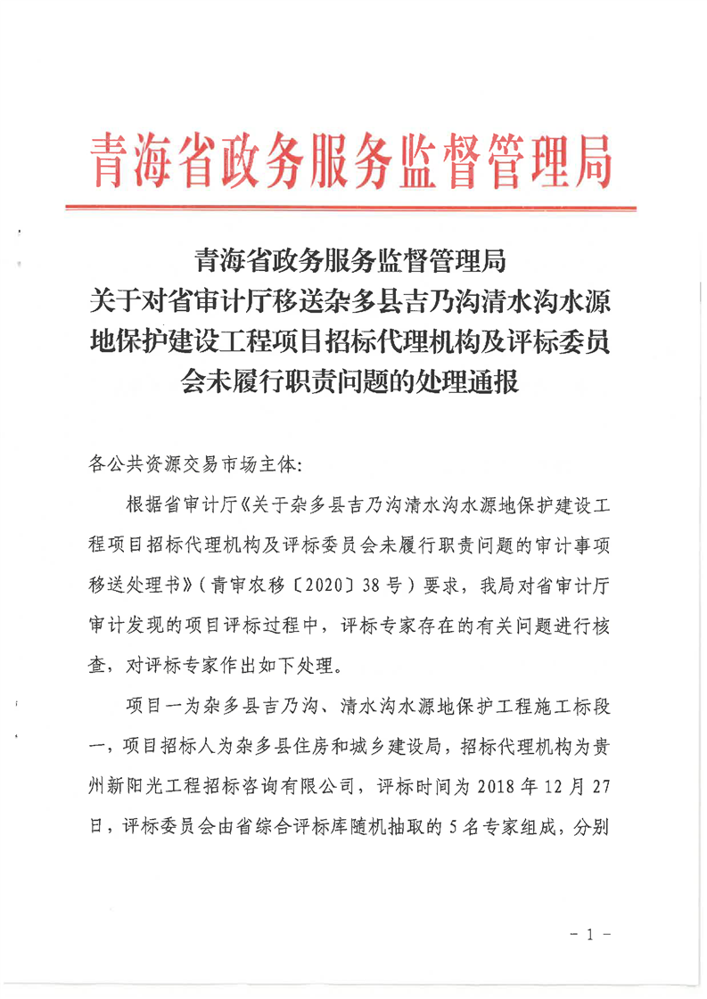关于对省审计厅移送杂多县吉乃沟清水沟水源地保护建设工程项目招标代理机构及评标委员会未履行职责问题的处理通报