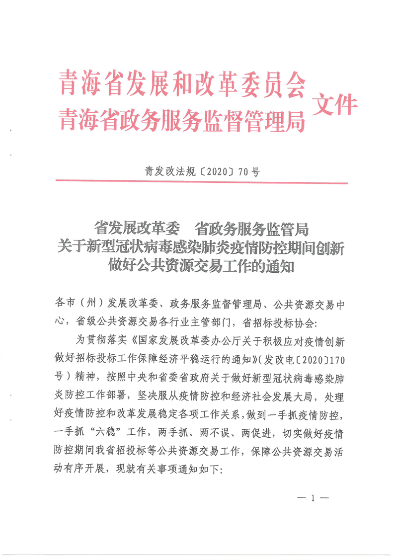 转省发展改革委、省政务服务监管局关于新型冠状病毒感染肺炎疫情防控期间创新做好公共资源交易工作的通知