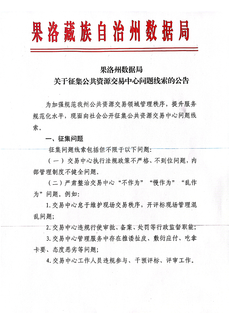 果洛州数据局关于征集公共资源交易中心问题线索的公告