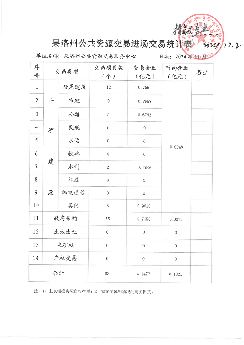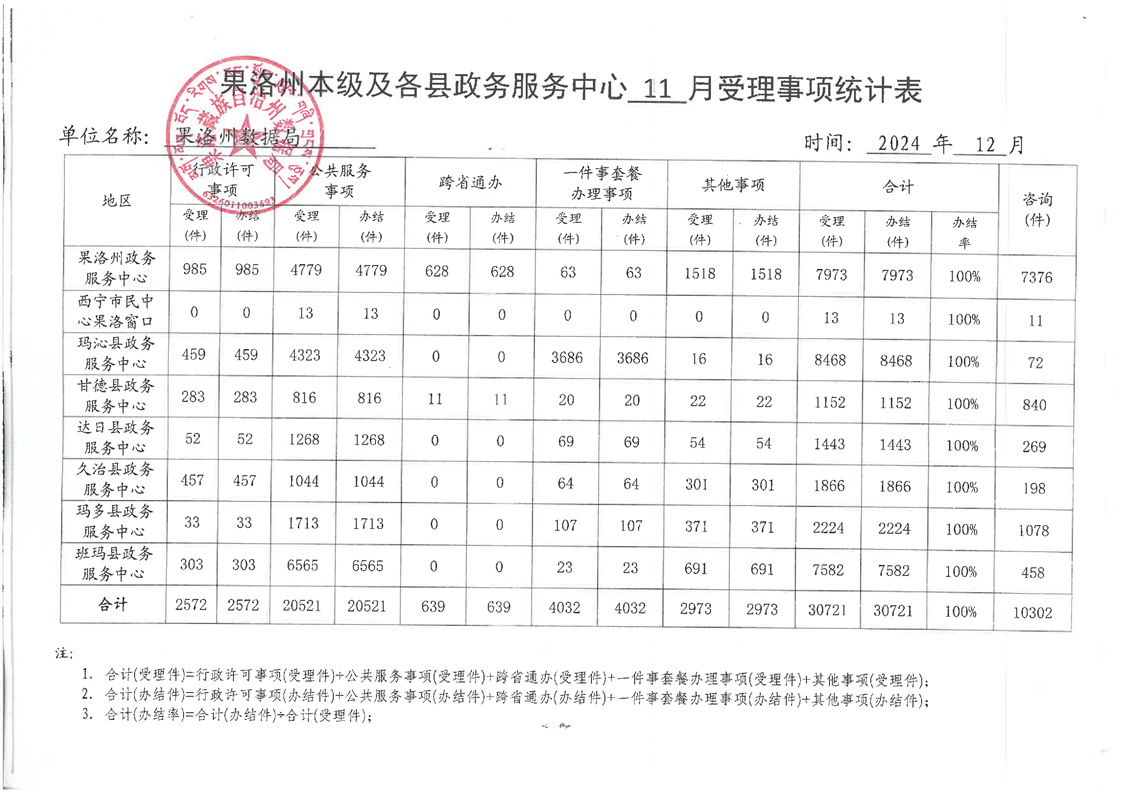 2024年11月份果洛州公共资源交易和政务服务办件情况