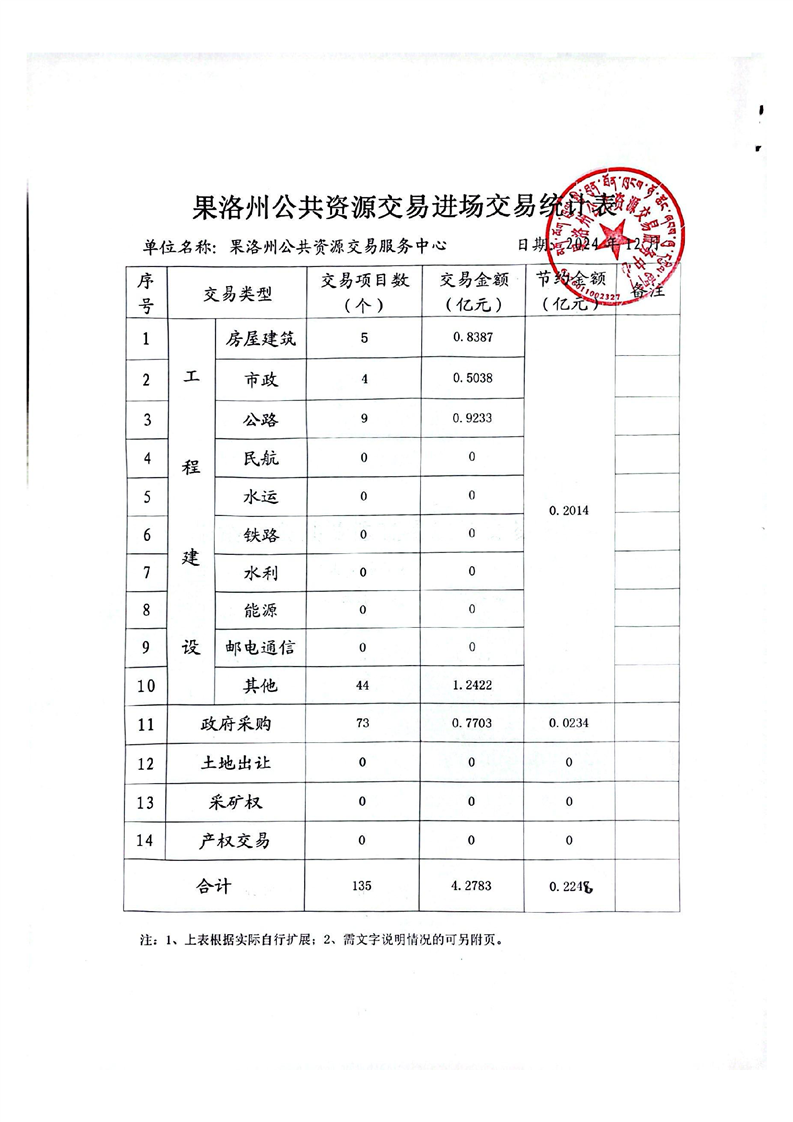 2024年12月份果洛州公共资源交易和政务服务办件情况