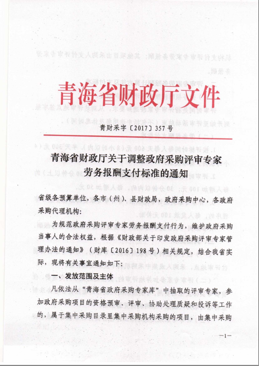 青海省财政厅关于调整政府采购评审专家劳务报酬支付标准的通知