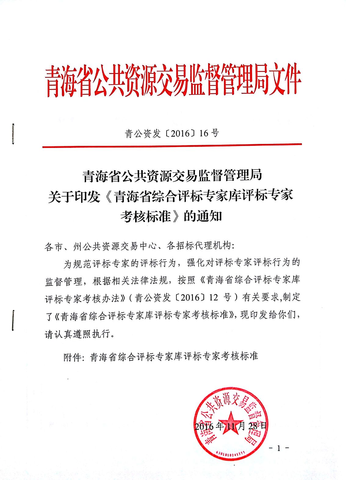 青公资发﹝2016﹞16号 关于印发《青海省综合评标专家库评标专家考核标准》的通知