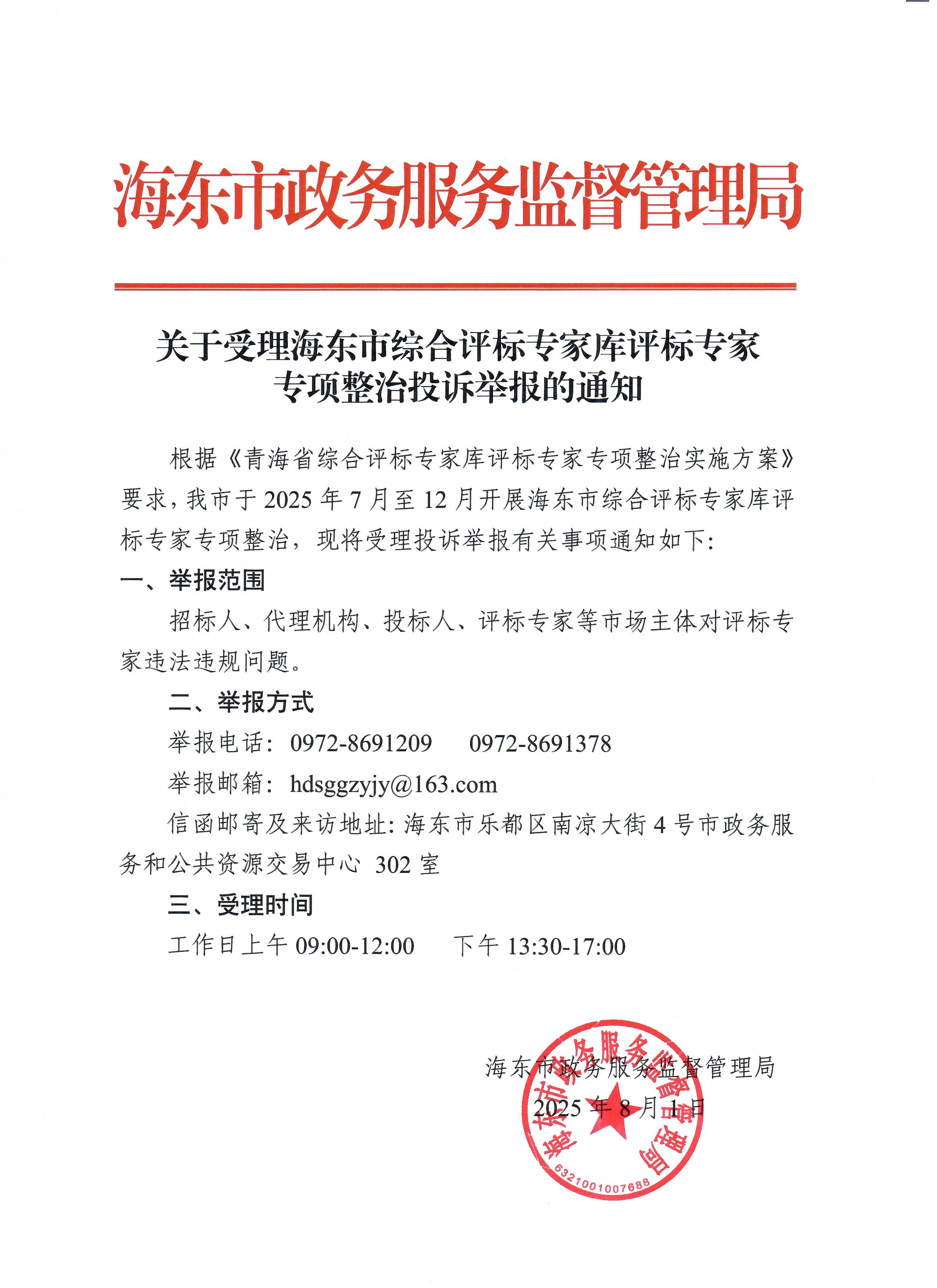 关于受理海东市综合评标专家库评标专家专项整治投诉举报的通知