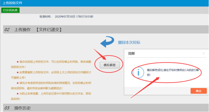 四、检查投标文件状态为“文件已递交”,点击“模拟解密”按钮(此时CA数字证书是插入状态),按照提示输入CA数字证书密码后点击确认,等待弹出结果提示: