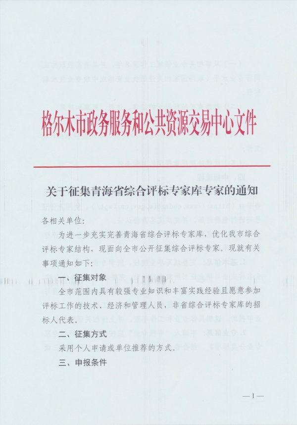 格尔木市政务服务和公共资源交易中心关于征集青海省综合评标专家库专家的通知