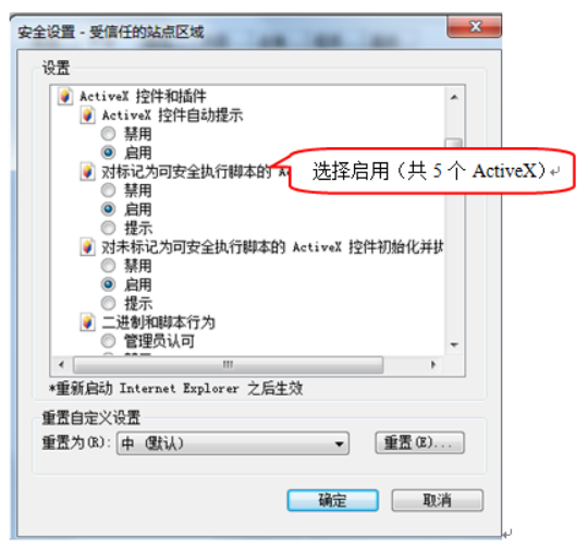 ①会出现一个窗口,把其中的Activex控件和插件的设置全部改为启用。