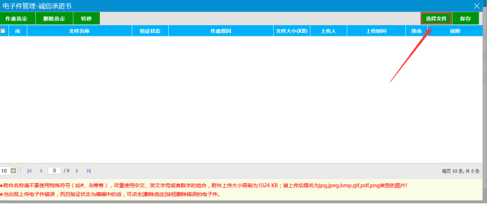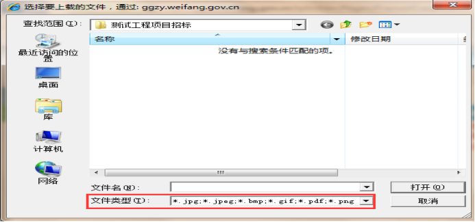 支持上传红色框中的格式的文件。选择需要上传的电子件,点击打开按钮即可。