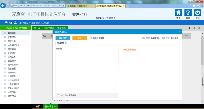 若无问题,点击提交信息,输入请求审核意见,确认提交。确认提交之后,填写的信息自动审核通过;