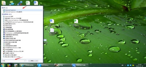 Win7系统点击左下角【开始】在搜索框输入,int找到IE浏览器并打开
