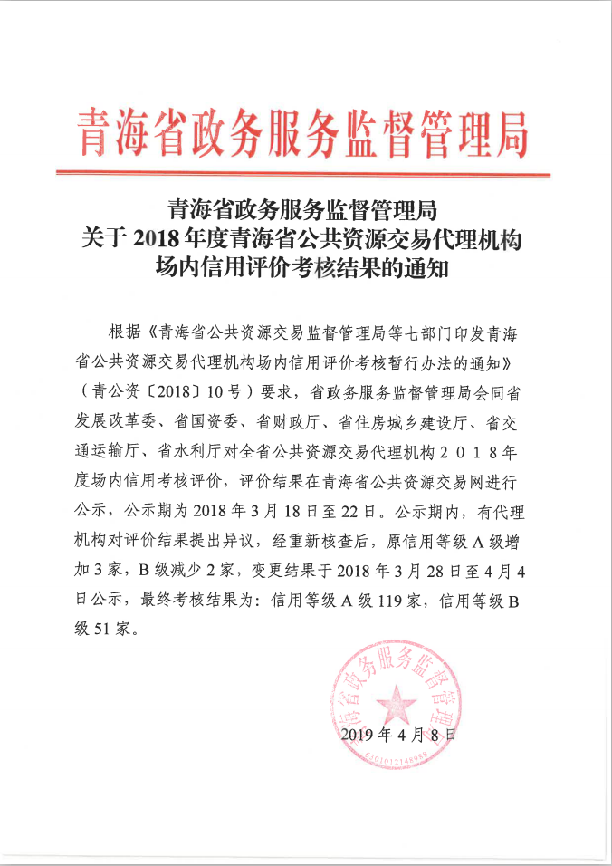 关于2018年度青海省公共资源交易代理机构场内信用评价考核结果的通知