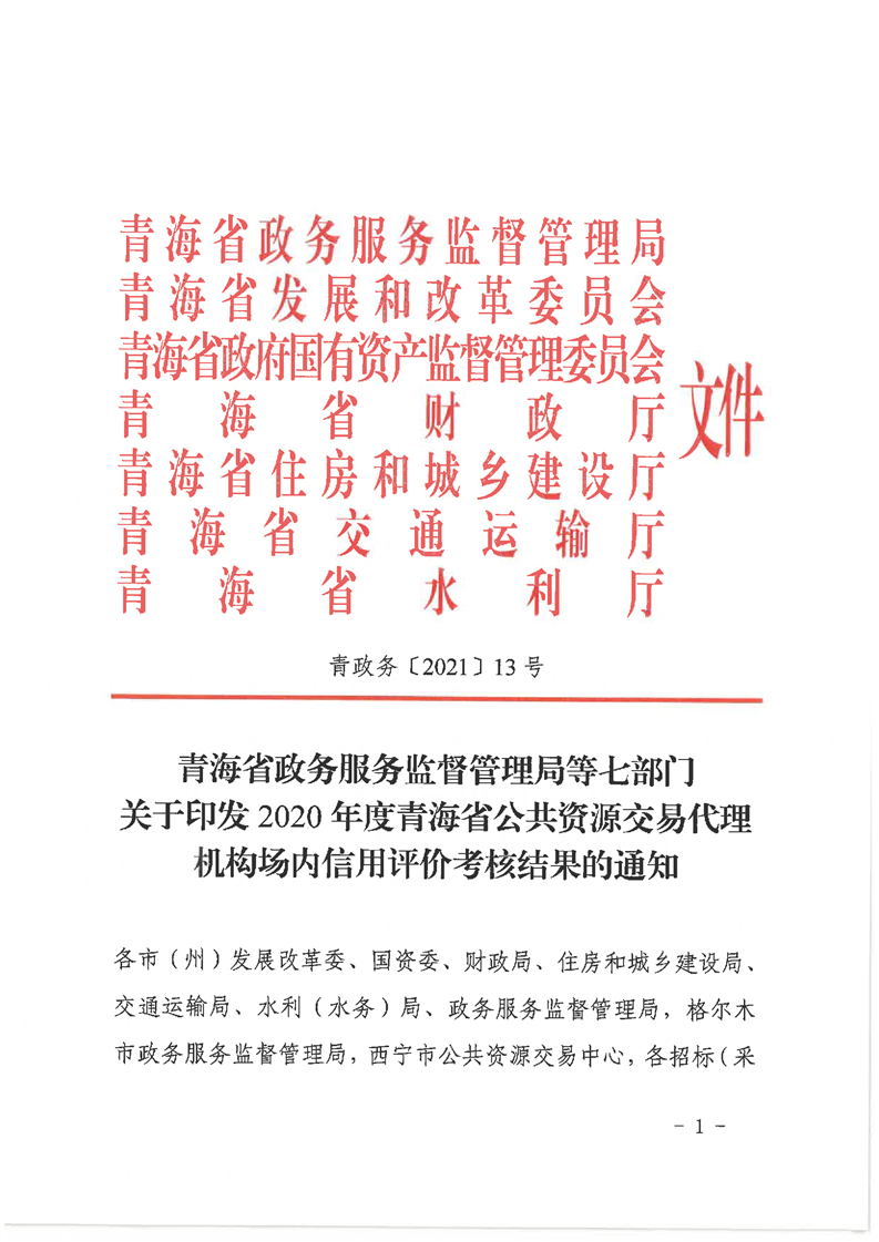 关于印发2020年度青海省公共资源交易代理机构场内信用评价考核结果的通知