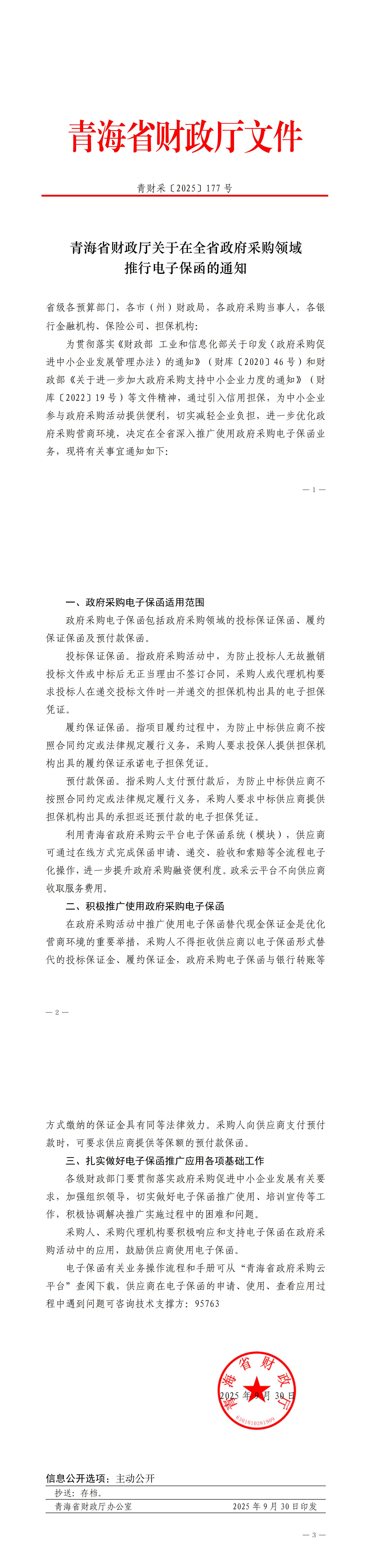 青海省财政厅关于在全省政府采购领域推行电子保函的通知