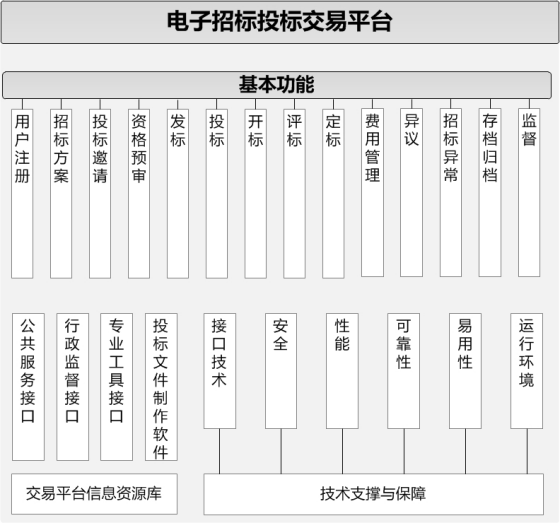 交易平台是以数据电文形式完成招标投标交易活动的信息平台。公共服务平台是满足交易平台之间信息交换、资源共享需要,并为市场主体、行政监督部门和社会公众提供信息服务的信息平台。行政监督平台是行政监督部门和监察机关在线监督电子招标投标活动的信息平台。