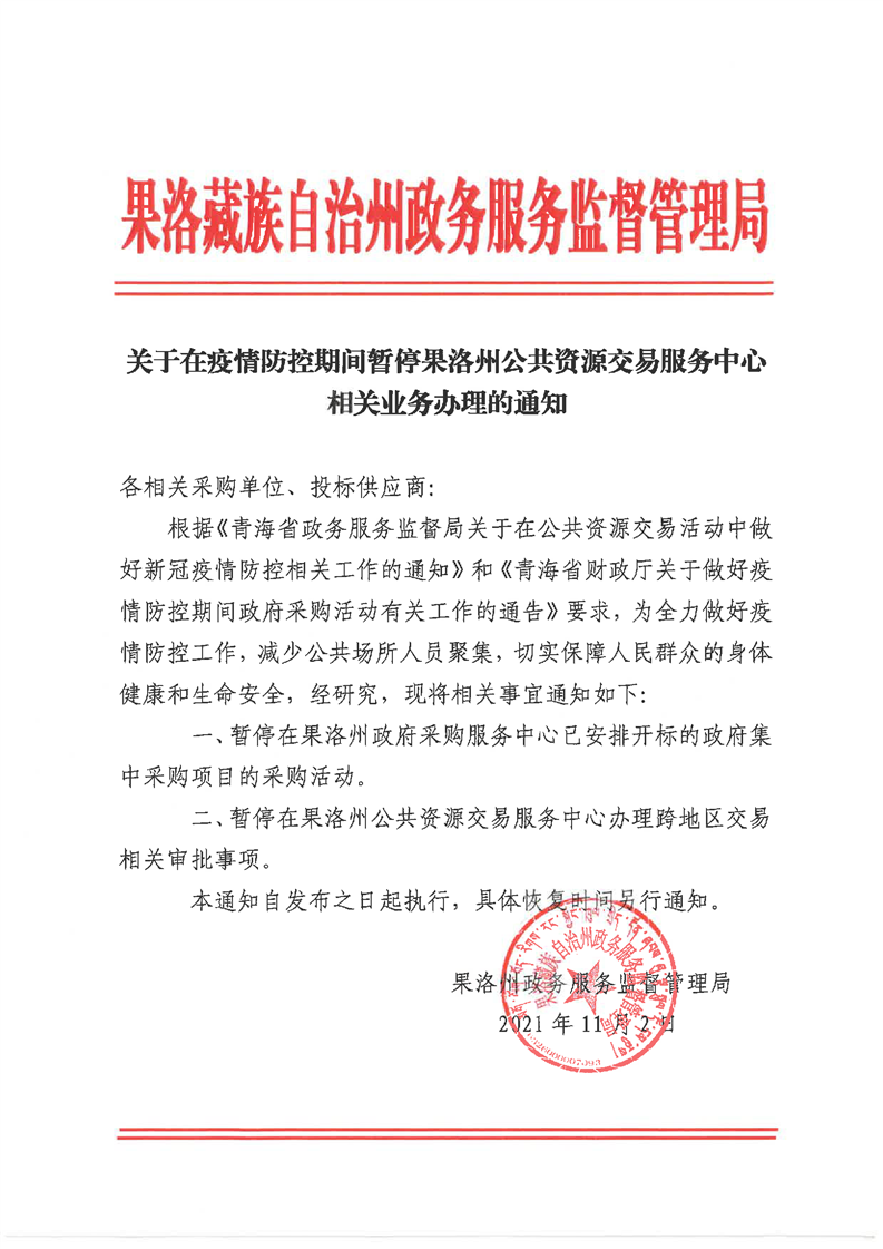 果洛州政务服务监督管理局关于在疫情防控期间暂停办理相关业务的通知