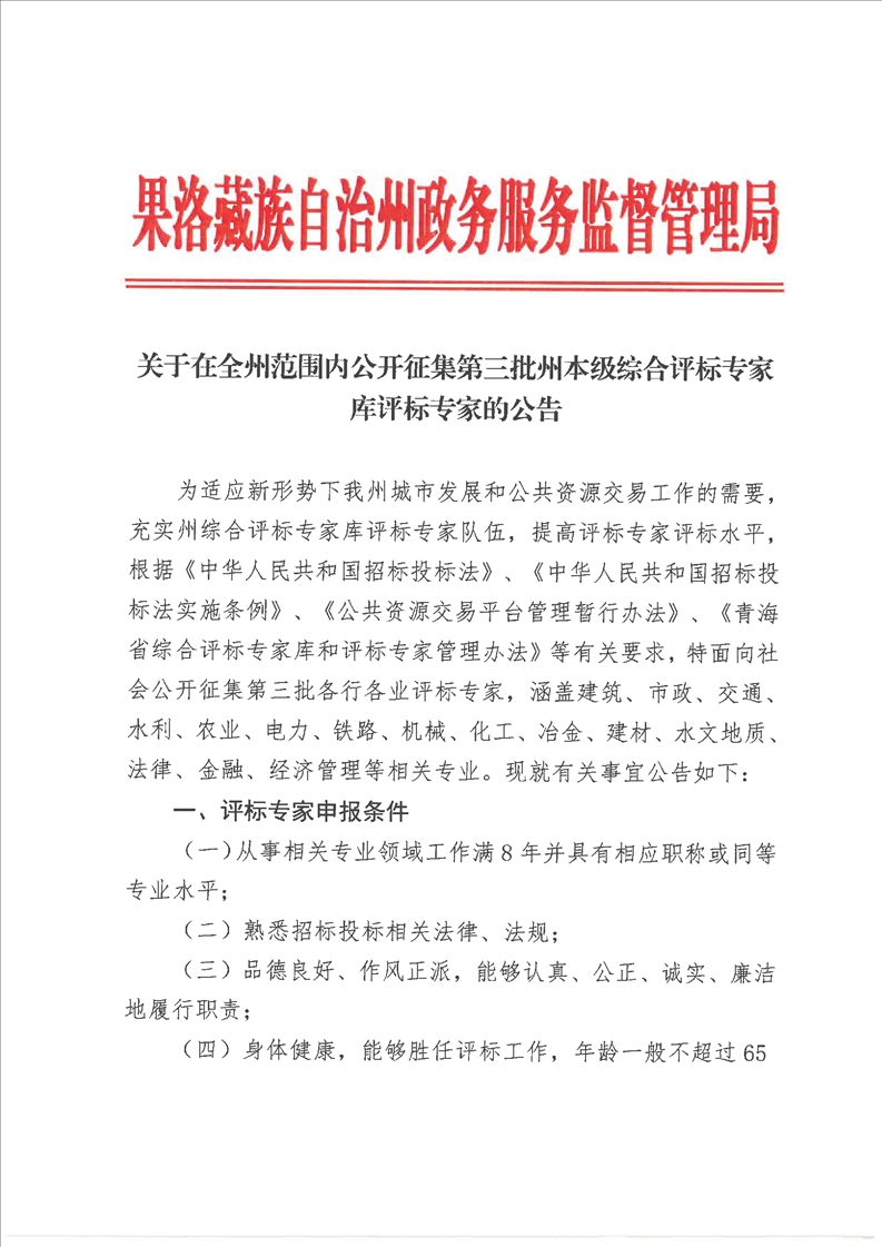关于在全州范围内公开征集第三批州本级综合评标专家库评标专家的公告