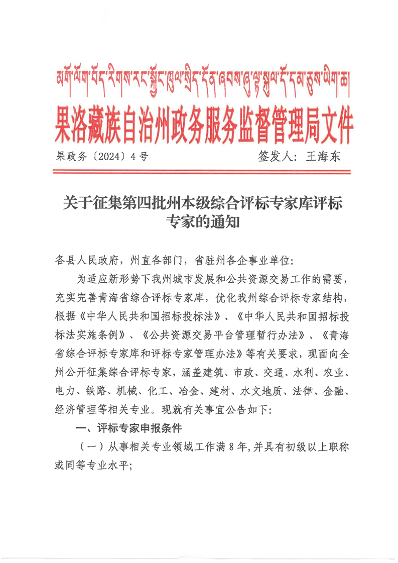 关于征集第四批州本级综合评标专家库评标专家的通知