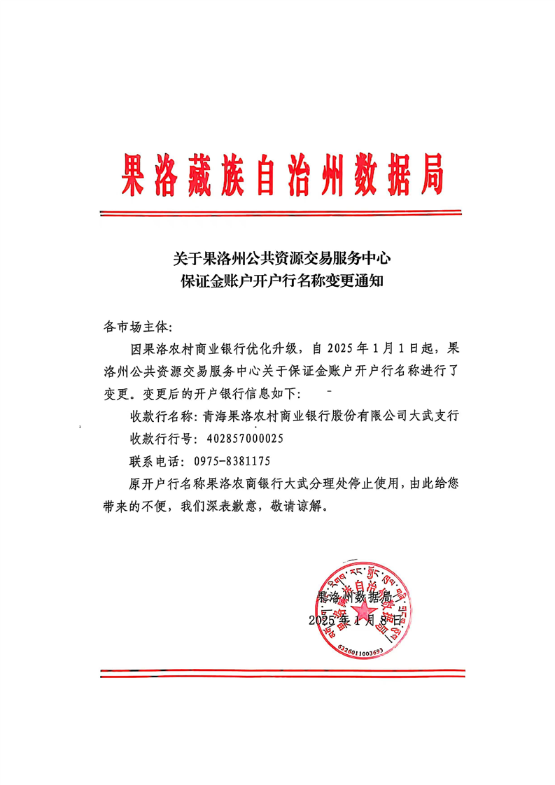 关于果洛州公共资源交易服务中心保证金账户开户行名称变更通知
