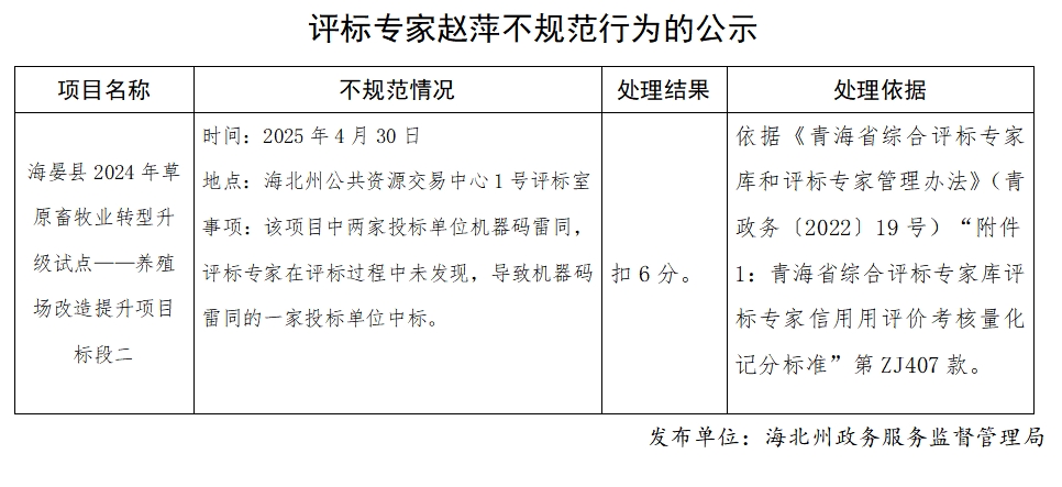 评标专家赵萍不规范行为的公示
