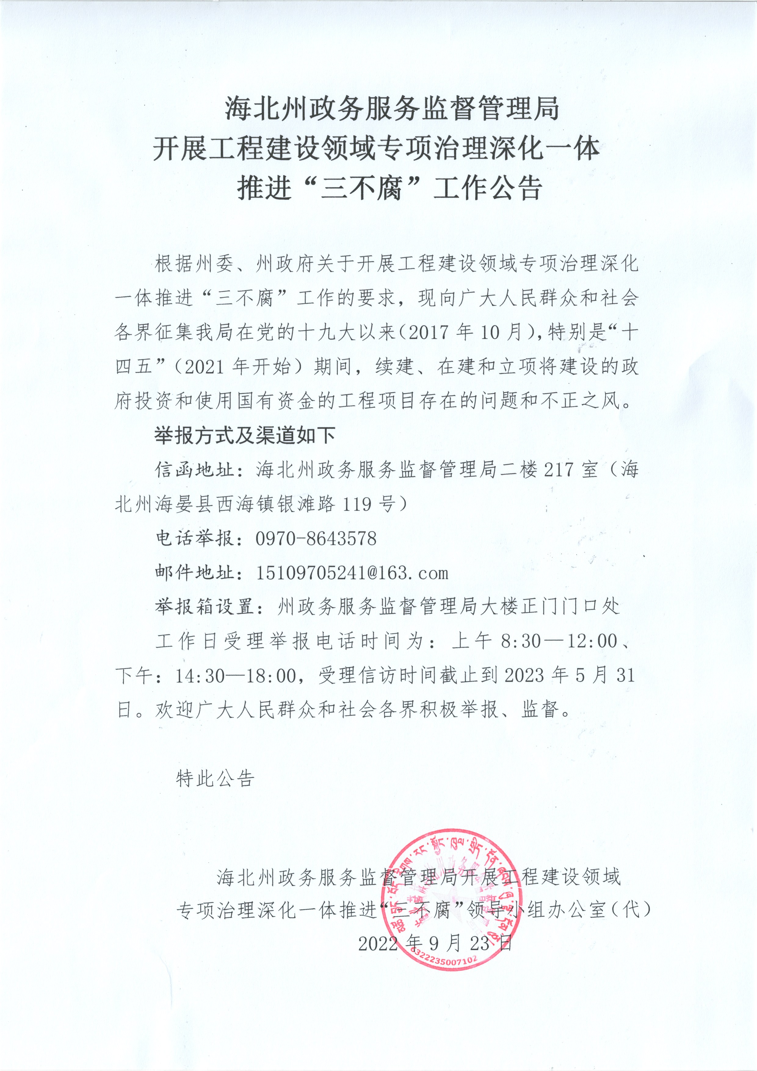 海北州政务服务监督管理局开展工程建设领域专项治理深化一体推进“三不腐”工作公告