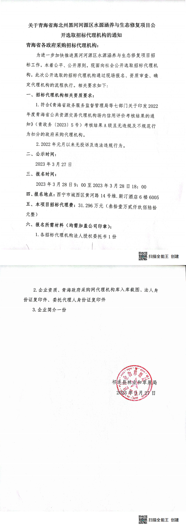 关于青海省海北州黑河河源区水源涵养与生态修复项目公开选取招标代理机构的通知