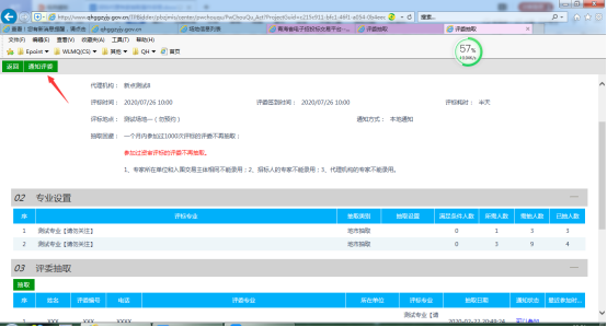 在【工程业务】--【专家抽取】菜单下点击【自动通知】点击相应项目后的操作按钮进入抽取通知页面