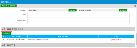 操作:在招标公告编辑页面,点击‘生成子账号’即可生成,同时发布的公告内容会自动新增关于保证金的内容
