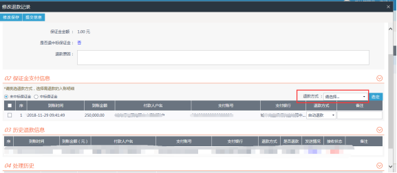 2、 如对中标单位进行退款则在02保证金支付信息中选择中标保证金,将所需退款项的退款方式为自动退款,修改保存后点击提交信息按钮。