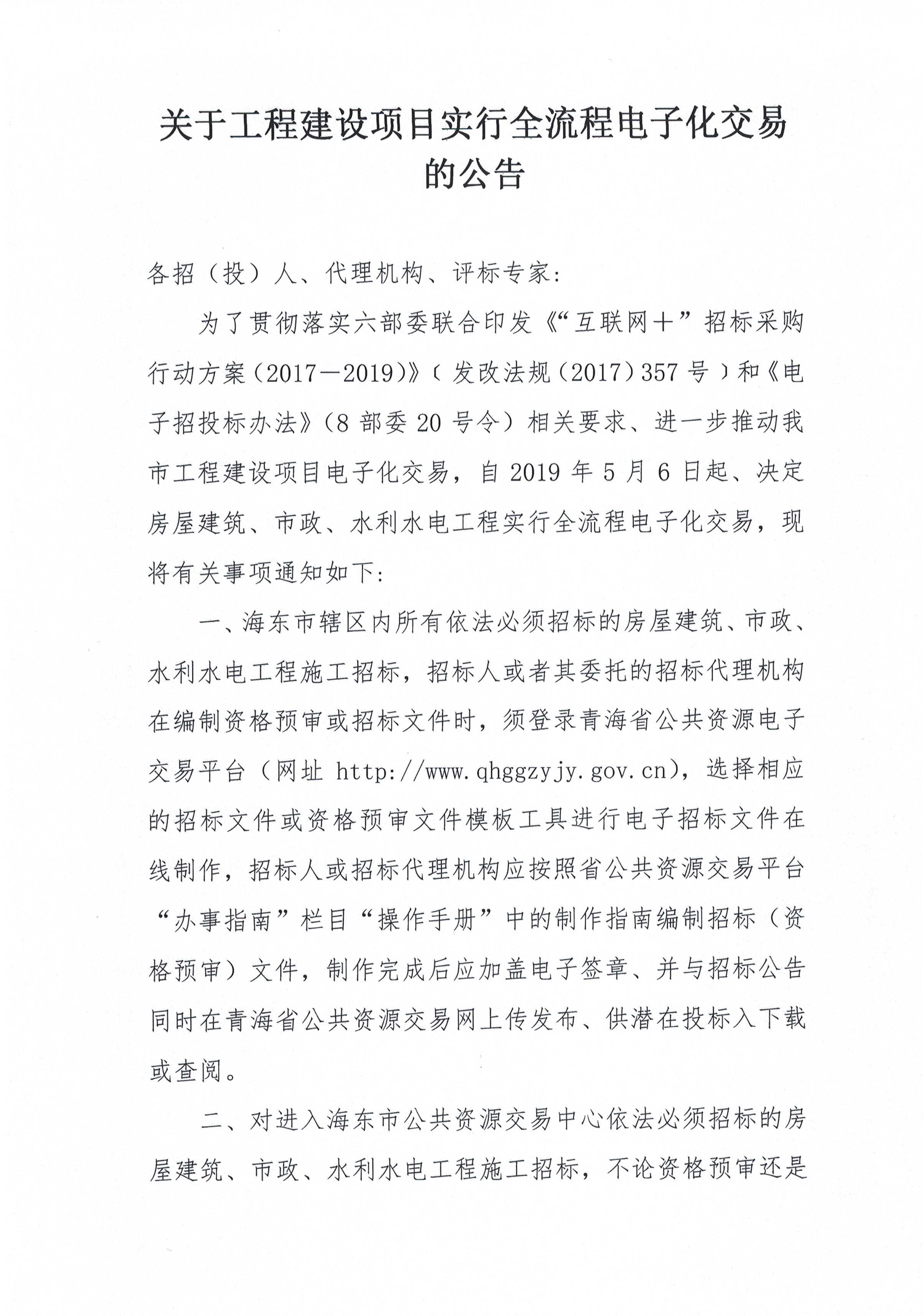 关于海东市工程建设项目实行全流程电子化交易的公告