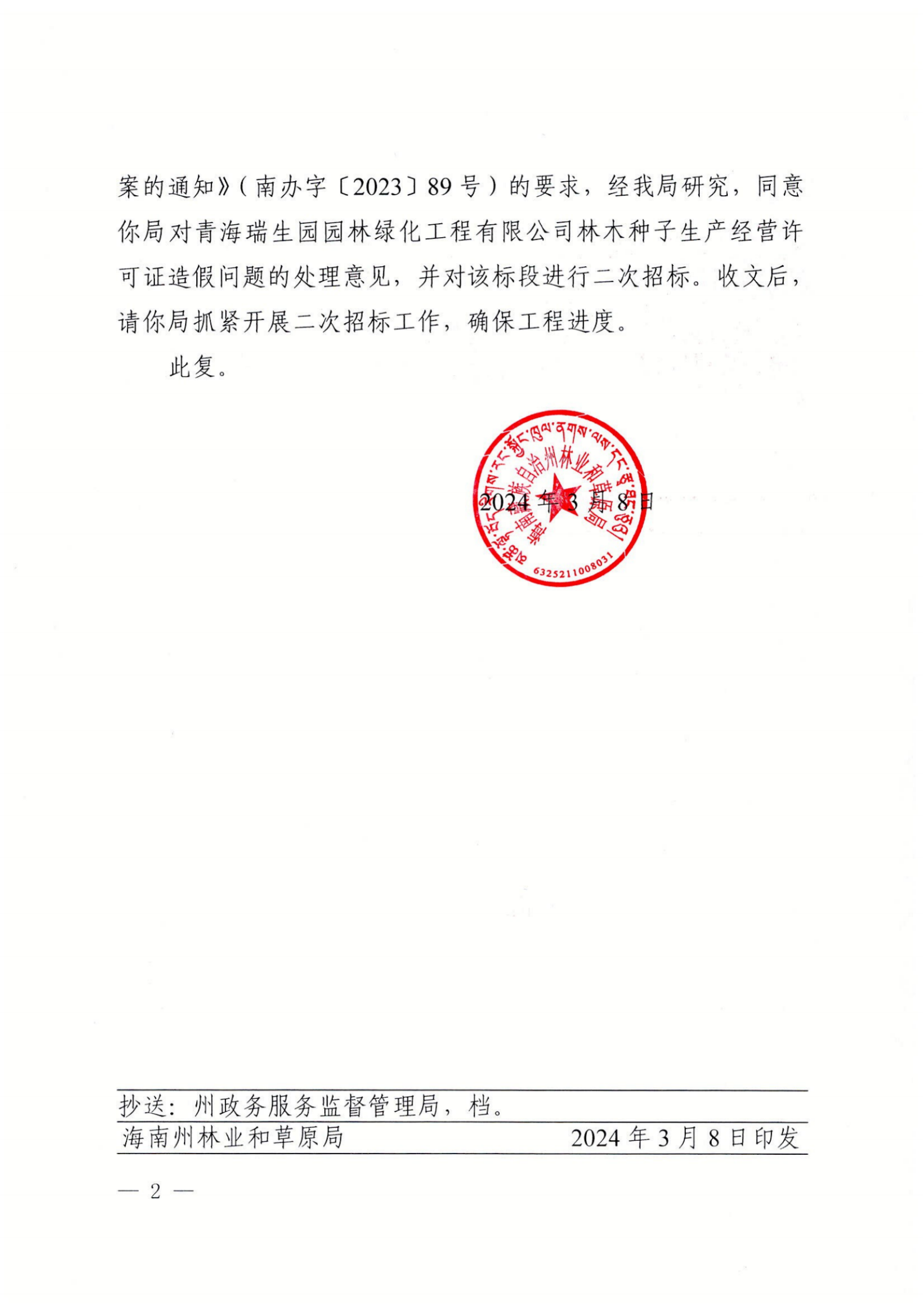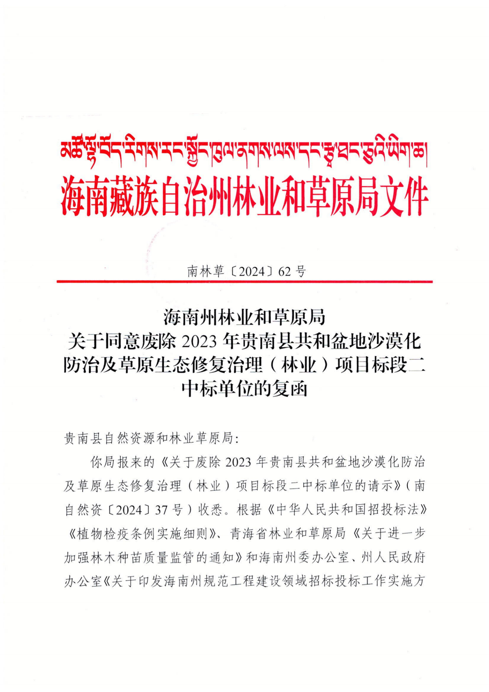 南林草【2024】62号 关于同意废除2023年贵南县共和盆地沙漠化防治及草原生态修复治理(林业)项目标段二