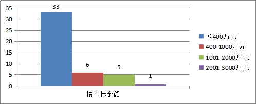 按中标金额分:小于400万元33个,400-1000万元6个,1000-2000万元5个,2000-3000万元1个。
