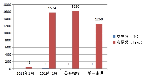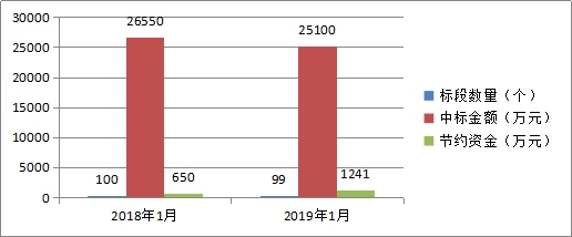 2019年1月1日-31日,累计成交标段99个,中标金额2.51亿元,节约资金0.1241亿元,同比下降5.2%;1月份新发布招标公告101个。
