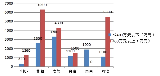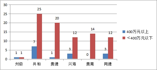按地区分:州级400万元以下1个340万元,400万元以上1个1260万元;共和县400万元以下25个2600万元,400万元以上7个6300万元;贵德县400万元以下20个3300万元,400万元以上1个4300万元;兴海县400万元以下12个1200万元,400万元以上3个1500万元;贵南县400万元以下14个1900万元,400万元以上0个;同德县400万元以下12个1100万元,400万元以上3个5500万元;