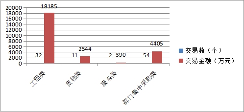 按交易类别分:工程类32个18185万元;货物类11个2544万元;服务类2个390万元;部门集中采购类54个4405万元。