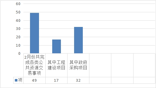(二)公共资源交易情况。2023年2月1日至2023年2月28日共完成各类公共资源交易事项49个,交易总额2.1845亿元,节约资金0.0726亿元。其中工程建设项目共计完成17个,交易金额1.5945亿元,节约金额0.059亿元;政府采购完成32个,交易总额0.59亿元,节约资金0.0136亿元。