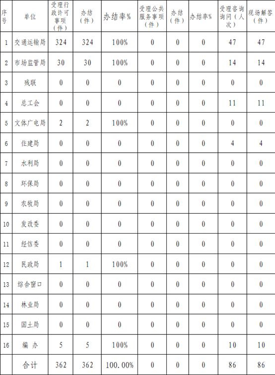 (一)行政服务办件情况。中心受理行政审批、公共服务、咨询询问等事项共计448件,其中:受理行政审批事项362件,已办结362件,办结率为100%,受理咨询询问人86次,现场解答人86次。办件单位是:交通运输局324件、市场监管局30件、编办5件、文体广电局2件、民政局1件。其他窗口有所办事项,在原单位办理或本月没有行政审批事项。