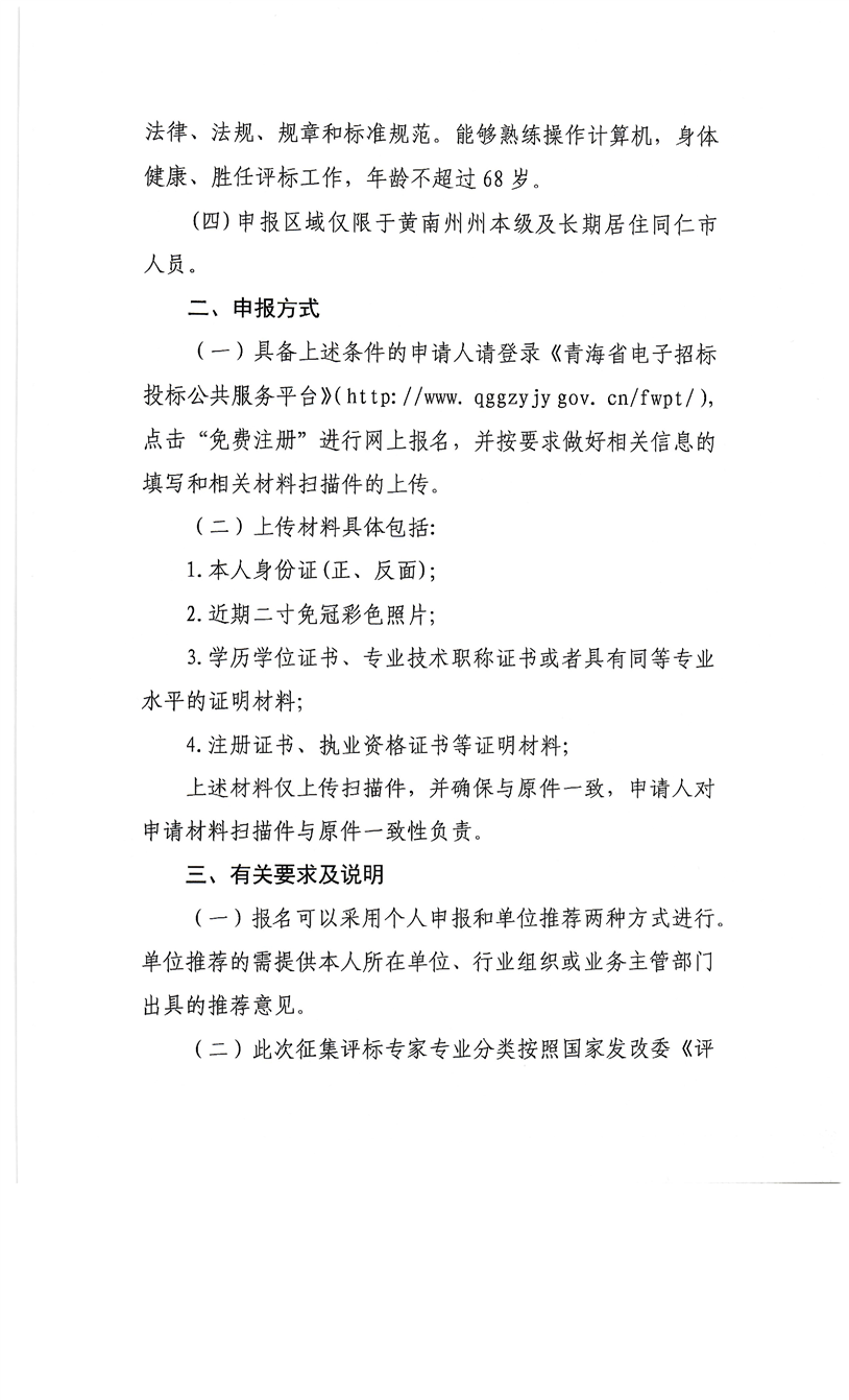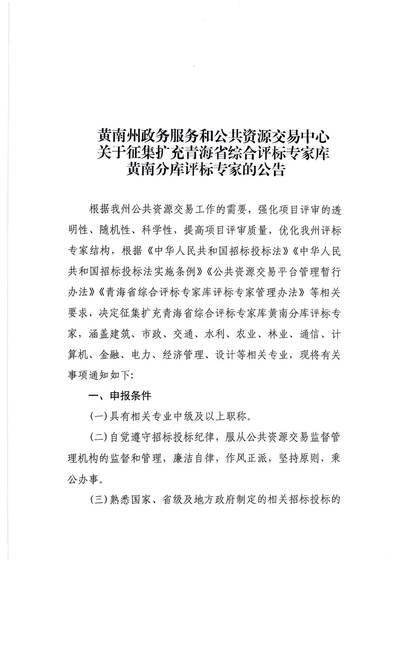 黄南州政务服务和公共资源交易中心关于征集扩充青海省综合评标专家库黄南分库评标专家的公告