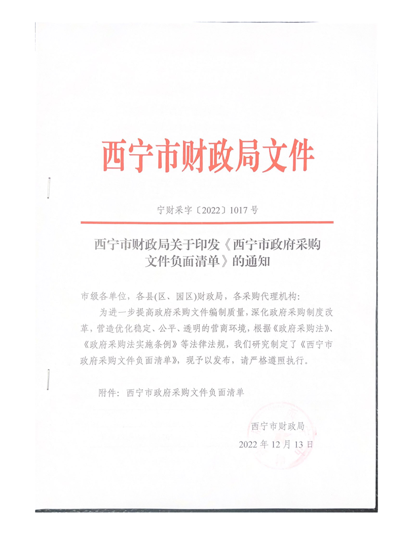 西宁市财政局关于印发《西宁市政府采购文件负面清单》的通知