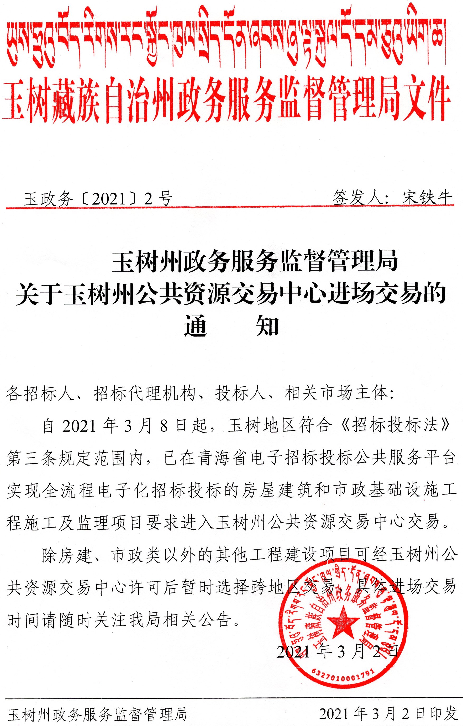 玉树州政务服务监督管理局关于玉树州公共资源交易中心进场交易的通知