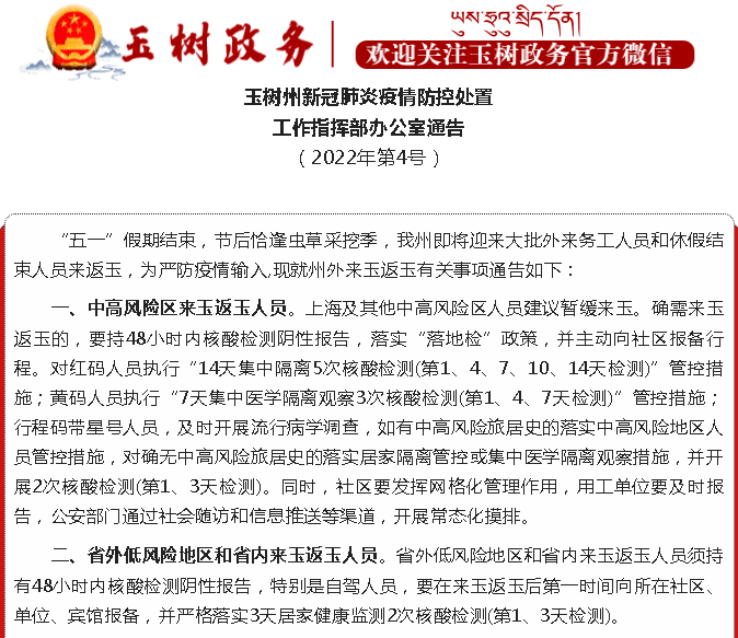 玉树州新冠肺炎疫情防控处置工作指挥部办公室通告