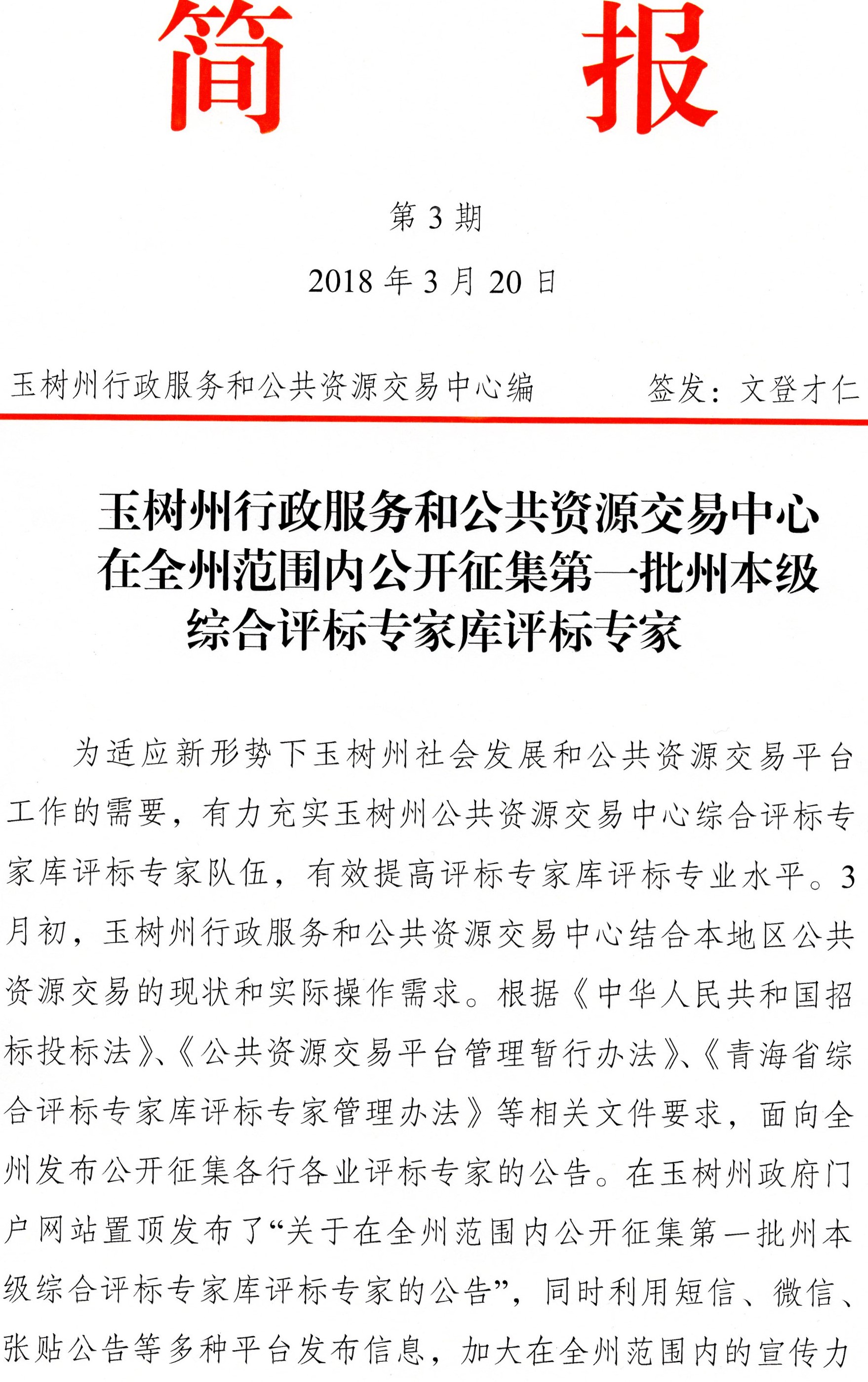 简报:为适应新形势下我州城市发展和公共资源交易工作的需要,充实州综合评标专家库评标专家队伍,提高评标专家评标水平,3月初,我中心结合本地区公共资源交易现状,根据《中华人民共和国招标投标法》、《青海省综合评标专家库评标专家管理办法》等有关要求,面向全市公开征集各行各业评标专家。在州政府门户网站置顶发布“关于在全州范围内公开征集第一批州本级综合评标专家库评标专家的公告”,并利用短信、微信、公告栏等多种方式,加大宣传力度,为我中心加快公共资源进场交易进度,迈出了坚实的一步。