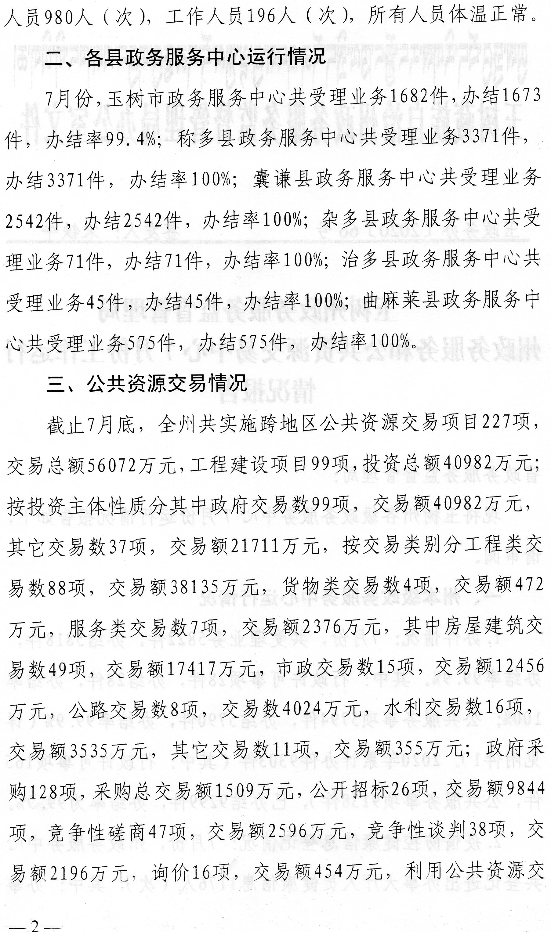 玉树州政务服务和公共资源交易中心7月份工作运行情况报告