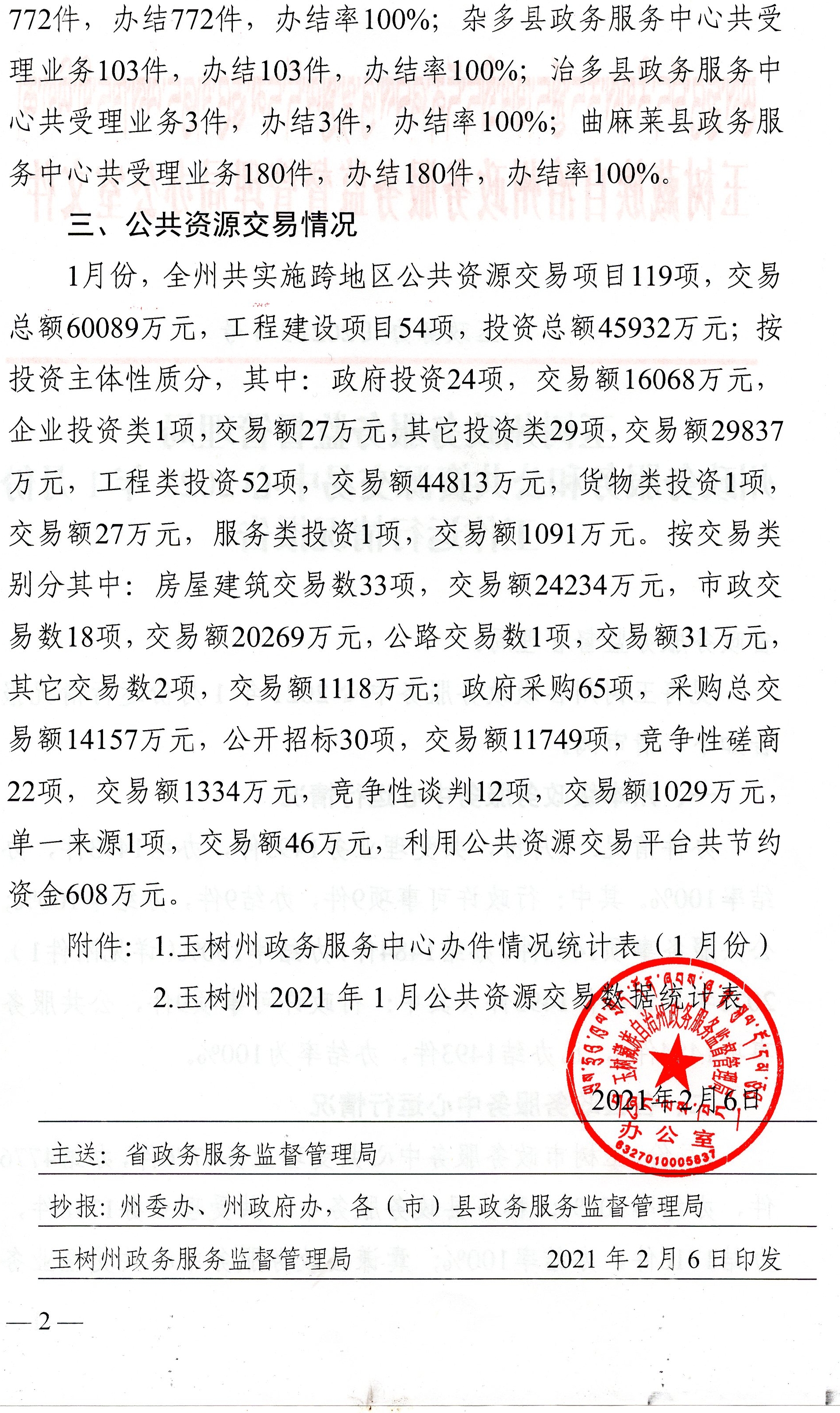 玉树州政务服务监督管理局政务服务和公共资源交易中心2021年元月份工作运行情况报告