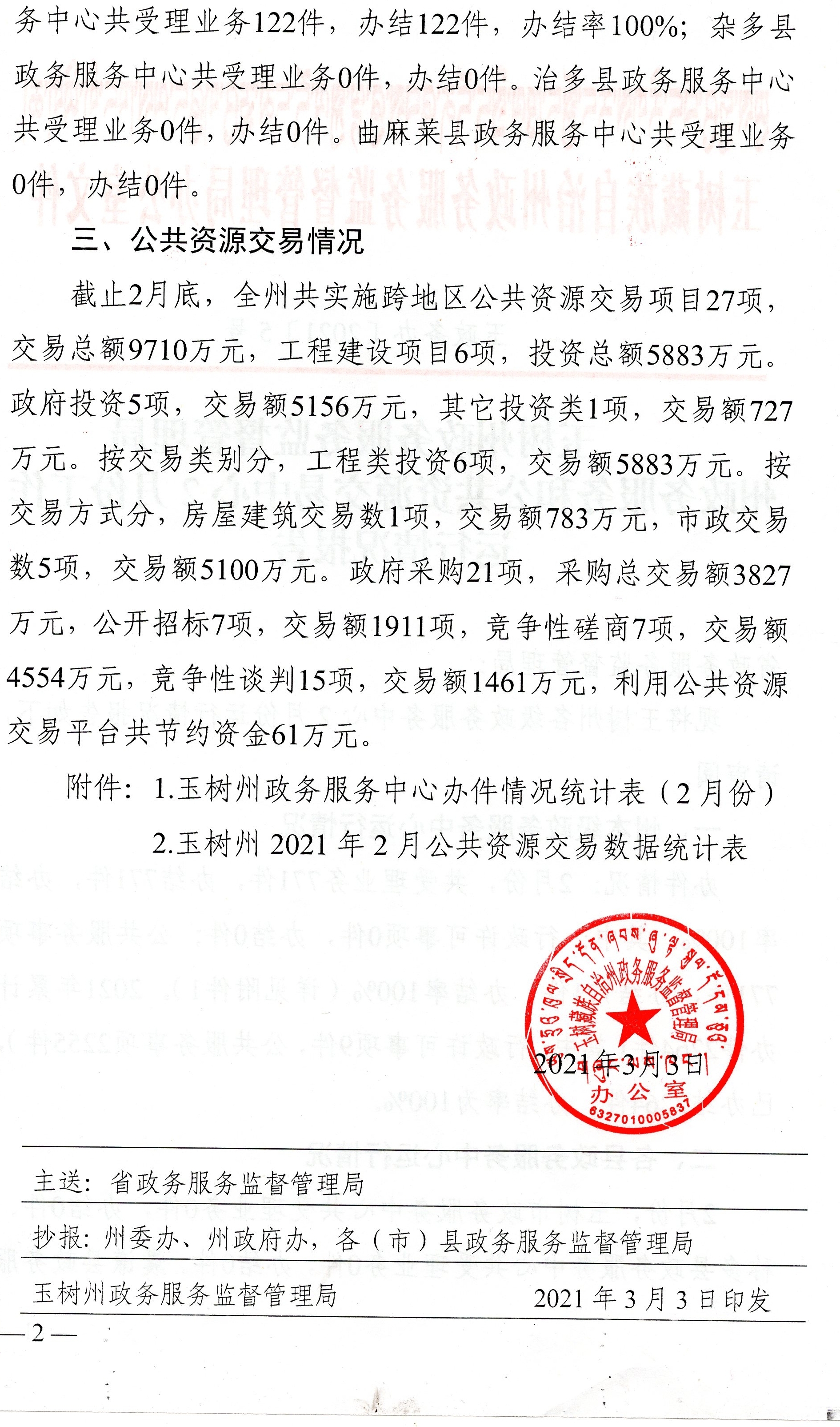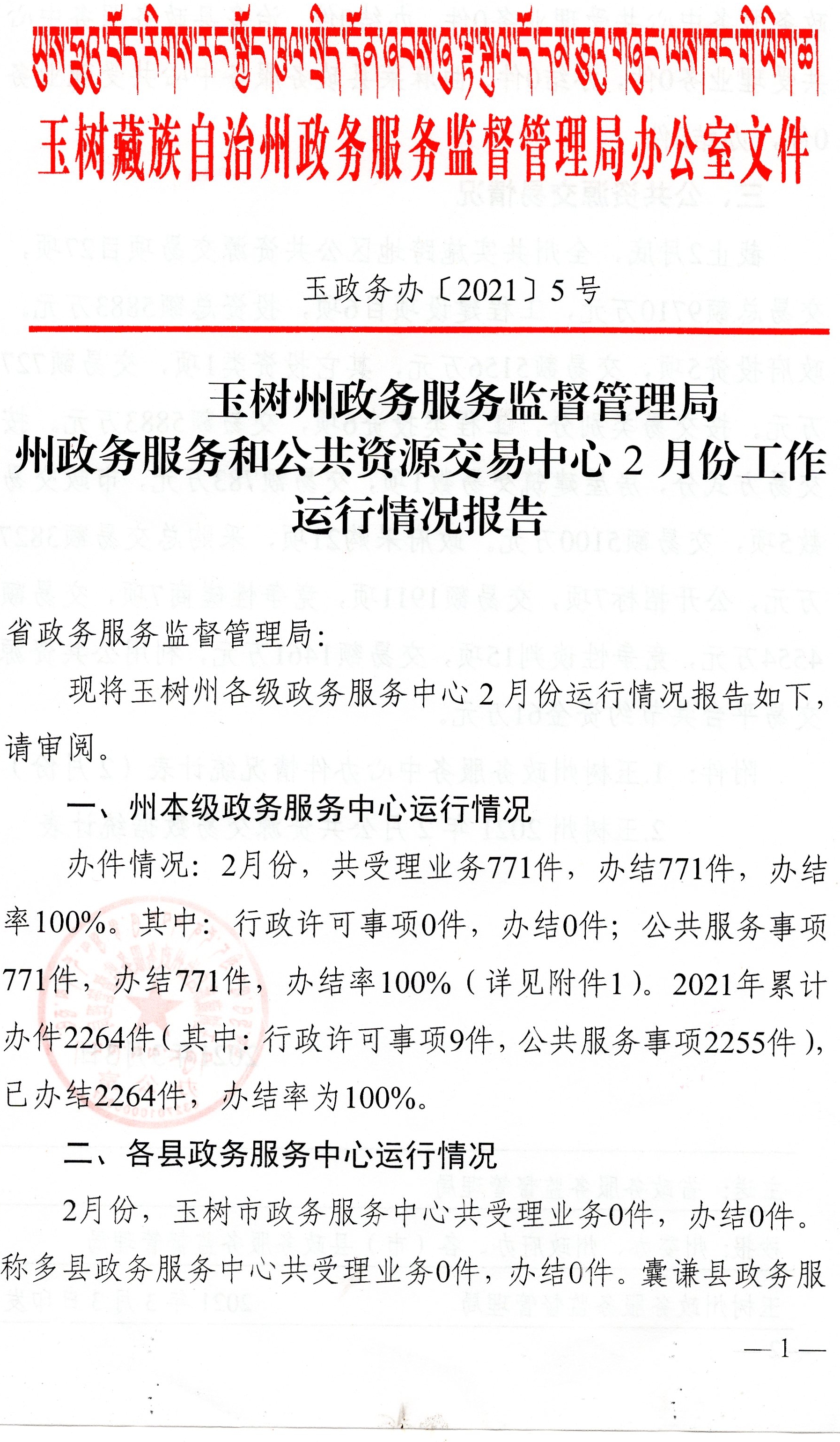 玉树州政务服务监督管理局政务服务和公共资源交易中心2021年2月份工作运行情况报告