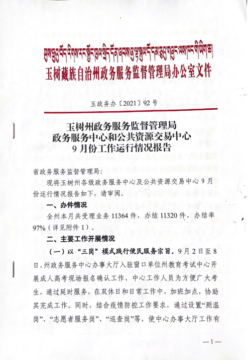 玉树州政务服务监督管理局政务服务中心和公共资源交易中心9月份工作运行情况报告