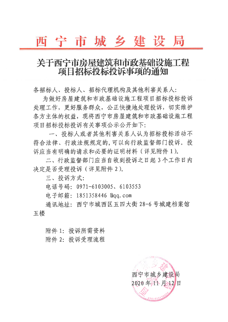 关于西宁市房屋建筑和市政基础设施工程项目招标投标投诉事项的通知